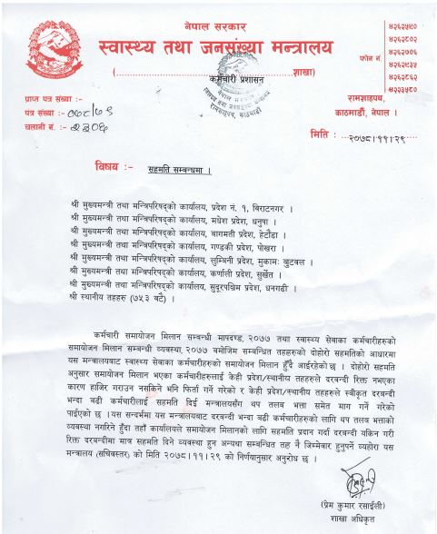 स्वास्थ्य मन्त्रालयले आइतबार सात वटै प्रदेश र ७५३ स्थानीय तहलाई परिपत्र गर्दै दरबन्दीभन्दा बढी कर्मचारीलाई तलब भत्ताको व्यवस्था नहुने स्पष्ट पारेको छ। अहिले कर्मचारी समायोजन मिलान सम्बन्धी मापदण्ड २०७७ तथा स्वास्थ्य सेवाका कर्मचारीको समायोजन मिलान सम्बन्धी व्यवस्था २०७७ बमोजिम सम्बन्धित तहहरूको दोहोरो सहमतिका आधारमा मन्त्रालयबाट स्वास्थ्य सेवाका कर्मचारीको समायोजन मिलान भइरहेको छ।